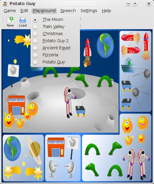 Spuds aren't your only choice, and there are, in fact, two different potato styles: the default leaner spud and a somewhat plumper, more classic tuber. Each tableau is referred to as a playground. Click Playground on the menu bar, and you'll find a moonscape to populate with spaceships, aliens and astronauts (Figure 2). Populate an ancient Egyptian scene, visit a snow-covered hill and decorate some Christmas trees, or start with a pizza crust and go wild with toppings.