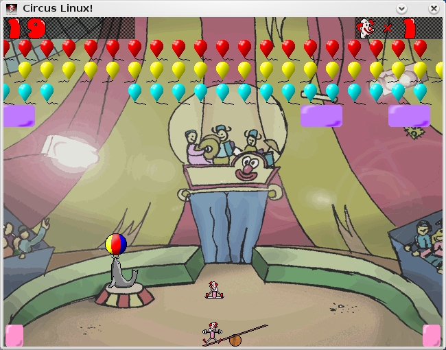 If it all sounds vaguely familiar, that's because Circus Linux is a clone of a really old Atari 2600 game called Circus Atari, albeit with better graphics. The whole bit about popping balloons is further reminiscent of any of a hundred incarnations of the classic Breakout. Circus Linux is a one- or two-player game, which means you can challenge your little clown to a game. The sound effects and music can be turned off or on from the intro screen. Other options include bouncing balloons and floating obstacles on which your clowns can crash and fall to the ground.