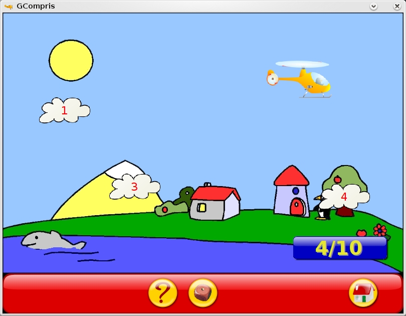 Reading activities include games to identify letters, match pictures to words, fill in missing letters and develop basic reading skills. Number games help players learn to count, identify numbers and do basic math. Those new to computers will find activities to develop keyboarding and mousing skills. There are lots of puzzles to work those brain cells, including several matching and memory games. Games? Yes, there are just plain-old games too. Kick a soccer ball into the goal, navigate a maze, go parachuting or pilot a submarine. In case you thought learning was anything but fun, check out the cool Numbers in Order game (Figure 8), which requires young pilots to fly into numbered clouds as they learn to count (the clouds do not necessarily appear in order).