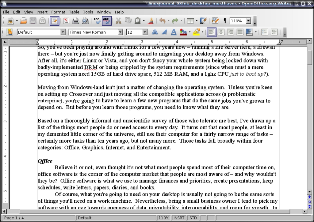 But, for my money, the OpenOffice.org suite stands head and shoulders above the rest. It reads and writes more formats better, and it's less crash-prone and more versatile than most of the alternatives (KWord from the KOffice suite being a notable exception, as it can double as a layout program in a pinch). OpenOffice.org is more resource-hungry though—its only major drawback. High-end spreadsheet users who require complicated scripted math also may want to check out Gnumeric (from GNOME Office) to supplement their office software, as its functions are more powerful.