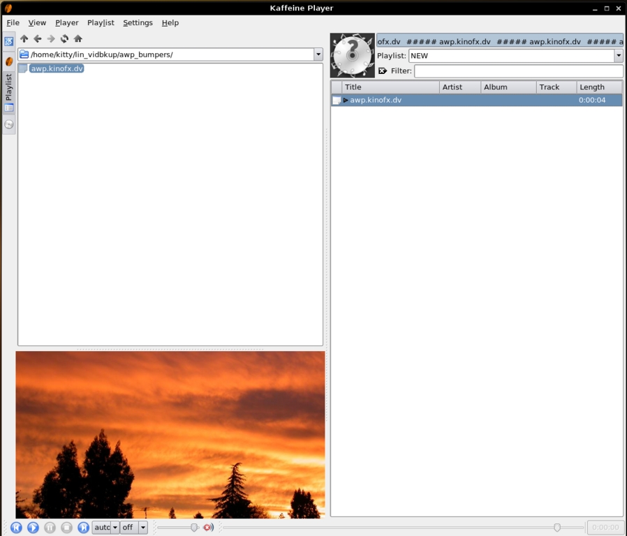 Figure 10. Kaffeine's playlist building interface, with a file browser on the left, a preview window under it, and the playlist on the right. Kaffeine is a Xine front-end.