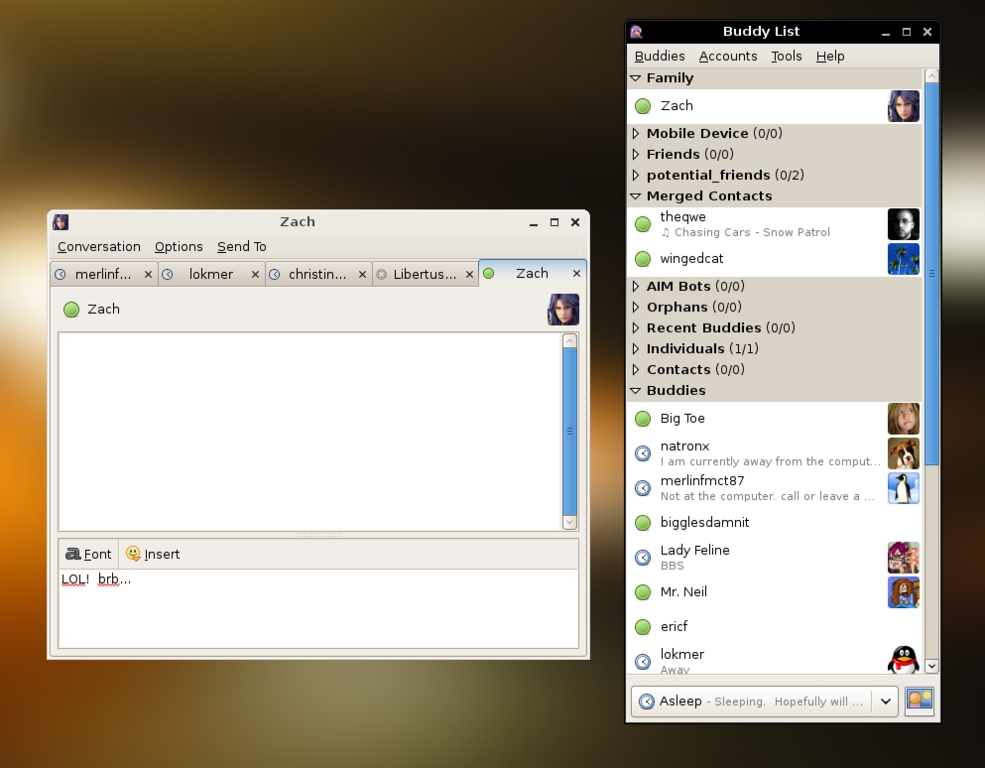 Figure 4. Pidgin sports a multiprotocol buddy list and a tabbed message interface to keep your chats well organized.