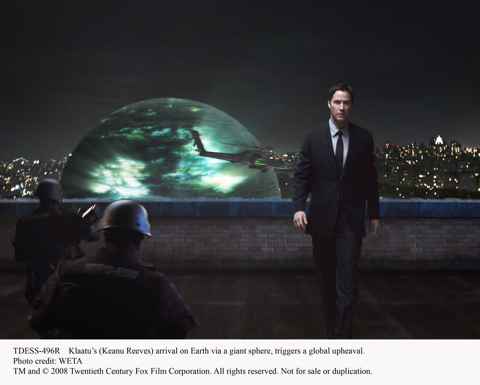 Klaatu's (Keanu Reeves) arrival on Earth via a giant sphere triggers a global upheaval. Photo credit: WETA.