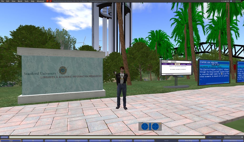 Stanford University (SLURL): slurl.com/secondlife/Stanford%20University%20Libraries/159/227/33