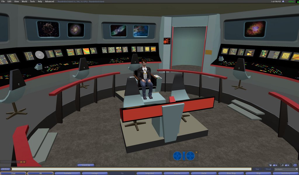 Our final stop on this slice of Second Life is the Sci-Fi Works store on Thunderbird Island. This place sells amazingly accurate reproductions of science-fiction spaceships and other sci-fi props. If you want to get an X-Wing fighter and hold a dogfight with a friend who's flying a TIE fighter, this is the place. Or if you're a Star Trek fan and want to pilot your own Enterprise or beam down to an alien world, that's an option too.