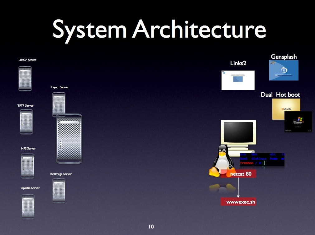FreeBoo is proposed as an open-source, alternative solution to Rembo. Instead of open-source software, FreeBoo is an architecture built from many existing open-source programs. In fact, the number of new lines of code is insignificant. We have written only eight simple scripts and have used the urldecoder script authored by Heiner Steven. Figure 1 shows the global picture. The open protocols used include TFTP, DHCP, HTTP and NFS. And, the open-source code, running either on the server or client includes PXELinux, rsync, partimage, Apache, Netcat, links2 and gensplash. In Figure 1, you can see which program is executed at each computer site (client or server).