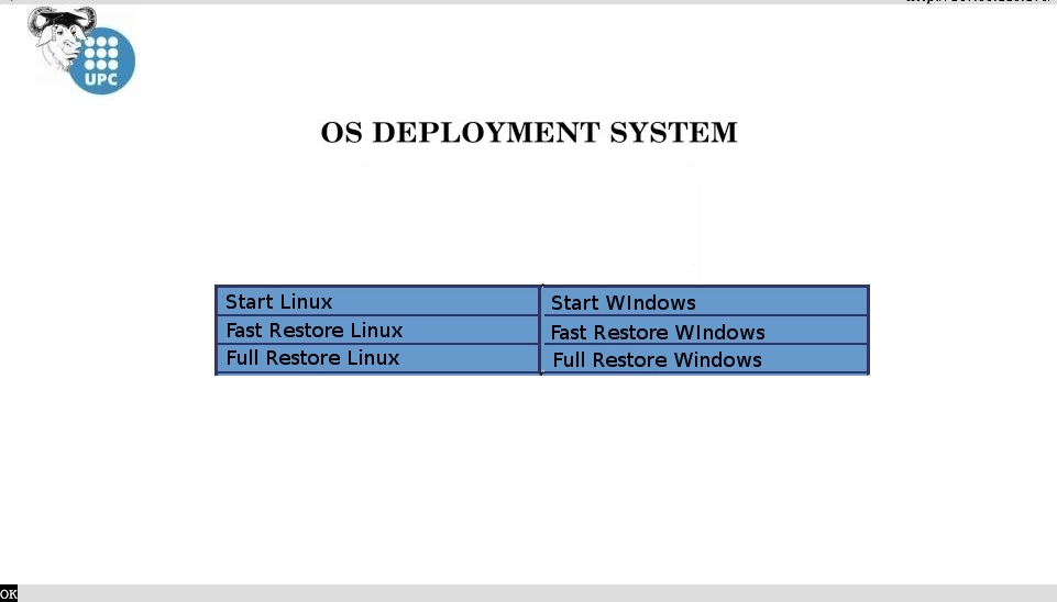 The menu provides two image restoring policies: complete (or full) restoring and partial (or fast) restoring. Complete restoring transfers all of the image to the client computer using partimage. Partial restoring transfers only the modified data using rsync. Depending on the differences with the current image, one solution is faster than the other. We have found that for partial restoring, the checksum computation was especially time consuming for large files. But, both solutions achieve the same goal—to deploy a clean and secure OS image on the client.