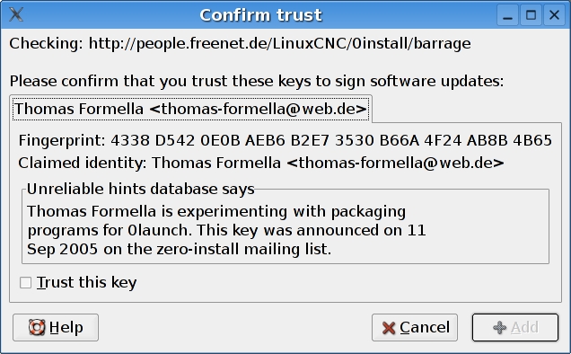 An installer window will pop up, displaying the package name and any dependencies you may require. In a few seconds, a window may appear, presenting you with a trust key (a GPG signed key), asking you whether to allow this key to run, which is similar to when your browser asks whether to accept a site's Authentication Certificate. As there aren't a great deal of packages available yet, trusting these keys is fine for now, but should they become popular, you will want to examine closely the key presented. Once the key business is out of the way, press Run, and the download of the new package will start along with any other dependencies. Once the download has finished, the new program should launch right away. If not, any error messages will appear in the shell.