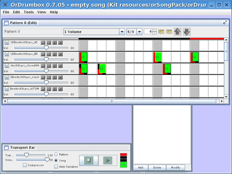 To start the program, enter orDrumbox.sh into your shell. If all goes well, the program now should be working. If you look in the top half of the orDrumbox screen, there should be a window called Pattern 0 (Edit)—this is where most of your work will happen. If you look to the right of the box containing a 4 at the top of the window, you'll see a gray and yellow box. Hover your mouse over it, and it will say, “create new track”. Press this a large number of times (14 and up for the default drum kit), as each line creates a new instrument with which to play. On the left of each line are the controls for each instrument, including volume and so forth. On the right is the Note Editor area.