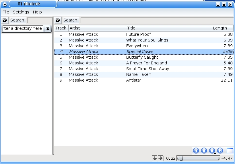 Minirok is a small music player for the K Desktop Environment. As its name hints, it's modeled after Amarok, but with a reduced set of features. In particular, it is designed to cover all the needs and wishes of the author, leaving everything else out. The look and feel is almost identical to Amarok's, though. The main interface is a tree view of the filesystem, with a playlist that can be populated only via drag and drop. There is no collection built from tags, so it's targeted at people whose collections are already structured in a tree at the filesystem level. Searches can be performed both in the tree view and the playlist.