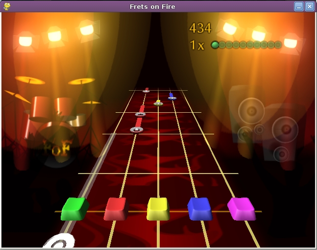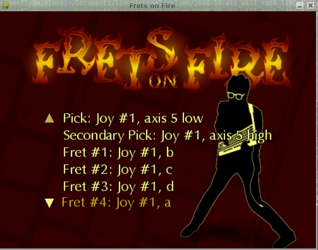 Of course, probably the best game for the Rock Band guitar on Linux is Frets on Fire. Frets on Fire is an open-source guitar game written in Python and packaged for a number of distributions and operating systems. By default, it is designed to be used with your regular keyboard held in your hands somewhat like a guitar. The F1–F5 keys are frets on the guitar, and the Enter key can be used to strum. That works okay, but it certainly is nicer to use a guitar intended for the purpose, and sure enough, Frets on Fire supports remapping the default keyboard keys to joystick buttons.