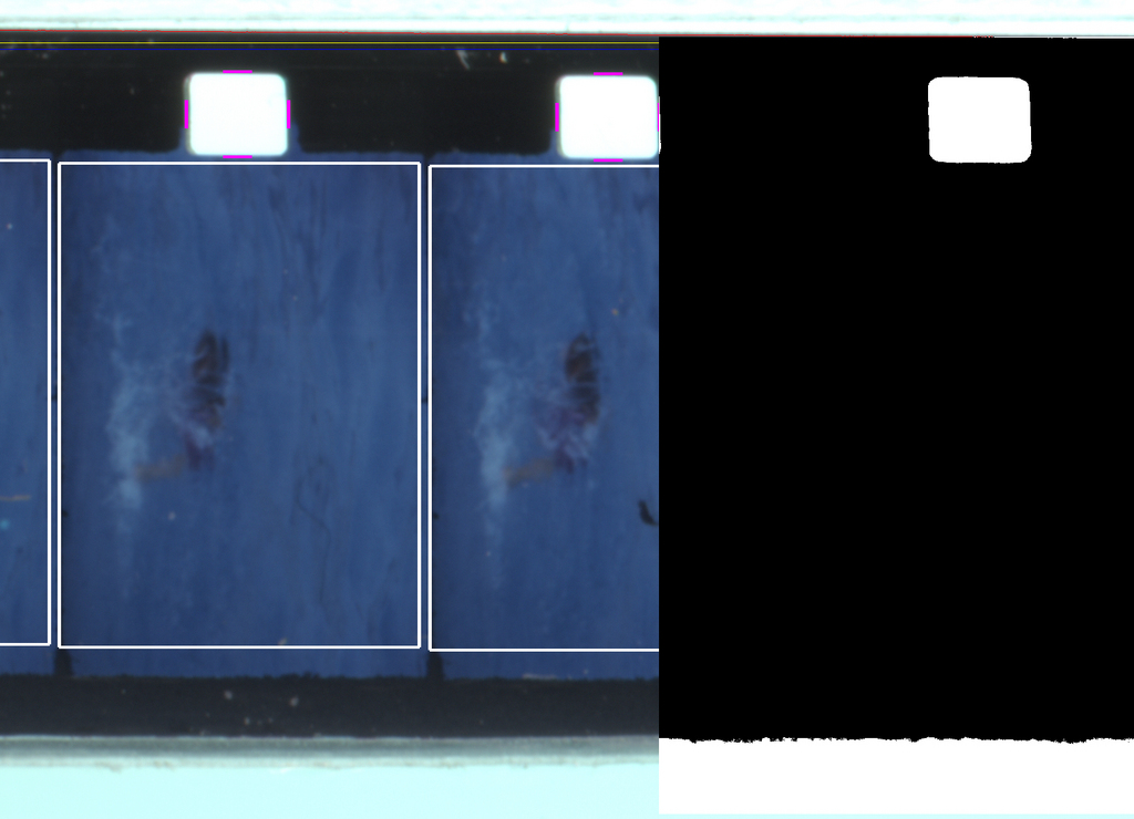 With the edges of the first sprocket hole located, we know approximately where the centerline of the next sprocket hole should be. Simple line searches left and right from that centerline are used to find the next set of sprocket hole edges. The search ends at the last sprocket hole in the segment. Once we have found the left and right edges, we search up and down to locate the top and bottom edges. The film in Figure 1 shows the sprocket hole and frame markup after scanning.