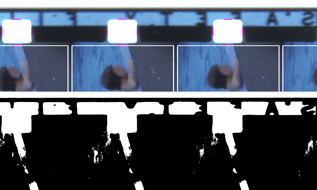 If everything were that simple, we would be done. Naturally, it's not. The film segment in Figure 2 illustrates two problems. First, Kodak edge-marks its film. It says “safety film”. Second, the image is not restricted to the frame area and has overlapped into the sprocket hole. Parts of the top and bottom edges of the sprocket hole have vanished in the B&W image. This will cause an edge-detection failure. There is a variety of heuristic methods to treat edge-detection failures. For left or right edge failures, I substitute the expected location based on the approximate sprocket center and the standard for the sprocket hole width. For top or bottom failures, my choice is to post-process the table of edges. When I find a missing edge or a run of missing edges, I average the edge values on either side of the gap and use the average as the location of the missing edge. It's important not to have abrupt changes in the sprocket hole locations, as this leads to visible jitter in the movie image.