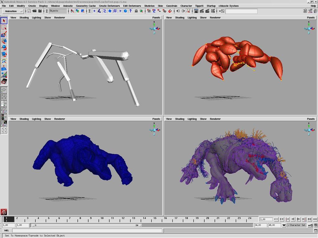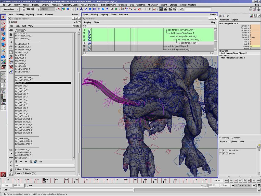 There are commercial Linux software tools available to Linux animators beyond big packages like Maya. “cMuscle is a system for simulating muscle movement”, says Darling. “We used it for muscle jiggle, skin jiggle, skin smoothing and sliding effects. We use SyFlex for the clothing worn by Red Cap and Hogsqueal. This system was augmented by some custom cloth/deformation software developed at Tippett Studio.”