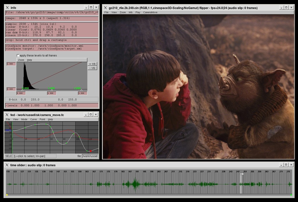 Hand animation is a challenging laborious process. “One guy does blocking, like moving chess pieces”, says Tippett Studio Animation Supervisor Todd Labonte. “You get it approved. We watch it over and over. You can go blind. We play it back in mirror image in our player or play it backward.” Labonte demonstrates playing back a scene of goblins invading the house, shown in their Flipper playback software, which can display a mirror image or play in reverse to help catch animation inconsistencies. Flipper is used to view both QuickTime and image frame sequences of DPX, EXR or TIFF with synchronized AIF audio. Flipper predates commercial Linux flipbooks, such as FrameCycler. At older studios, like Tippett, it's common to find proprietary Linux tools created before commercial options were available. Tippett has a team of eight Linux programmers to maintain and develop tools.