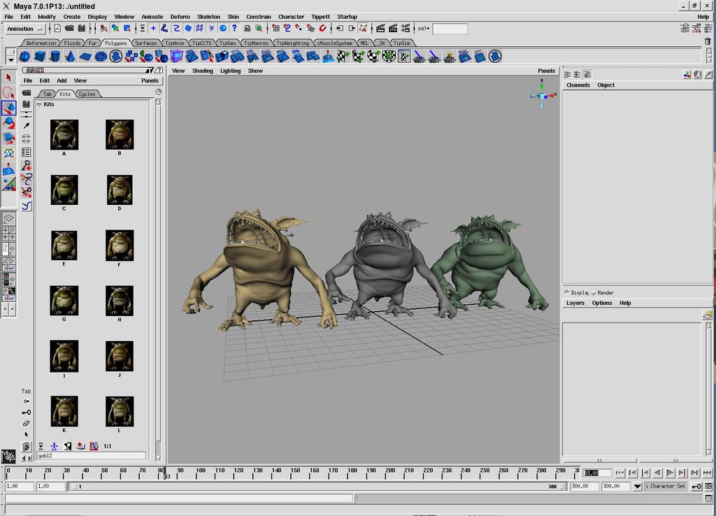 Figure 1. Tippett Studio's proprietary Creature Manager is used to maintain a library of creatures and animation cycles. The tool allows an artist to select and preview animation by pressing the larger creature button, then selecting a combination of an appropriate physical appearance for that creature from a predefined library and placing any number of selected creatures into a Maya scene.