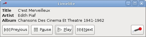 Limelite's main window is divided in two. The top shows data about the currently playing song, and the bottom has common media controls (play, pause, next and so on) and a toggle button that enables or disables karaoke mode.