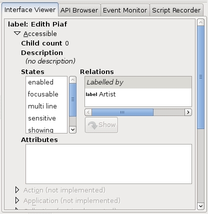 Finally, in the Accessible section in Accerciser's Interface Viewer plugin, we could verify that the defined relationships are coming down the wire and are provided to the assistive technology.