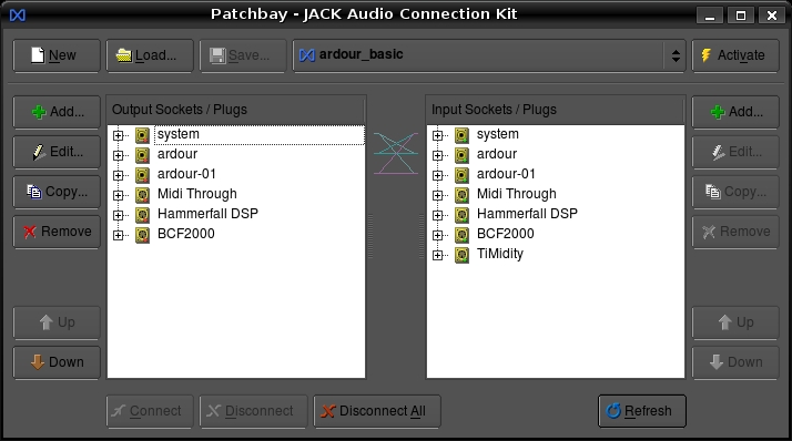 Once you've cross-connected the surface and Ardour, you can save the setup for future sessions, so you don't have to go through this rigmarole every time. Click on the patchbay button in qjacktcl. In the patchbay window that appears, click New, and then press Yes when you're presented with a dialog that asks whether you would like to “Create patchbay definition as a snapshot of all actual client connections”. Save the definition. Now, any time you start JACK, you can load up that patchbay setup by selecting it and clicking Activate.