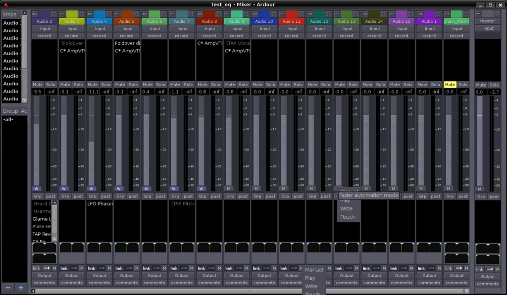 Figure 5. Ardour's Mixer Window with the Automation Modes for a Pan Pot and a Fader Showing