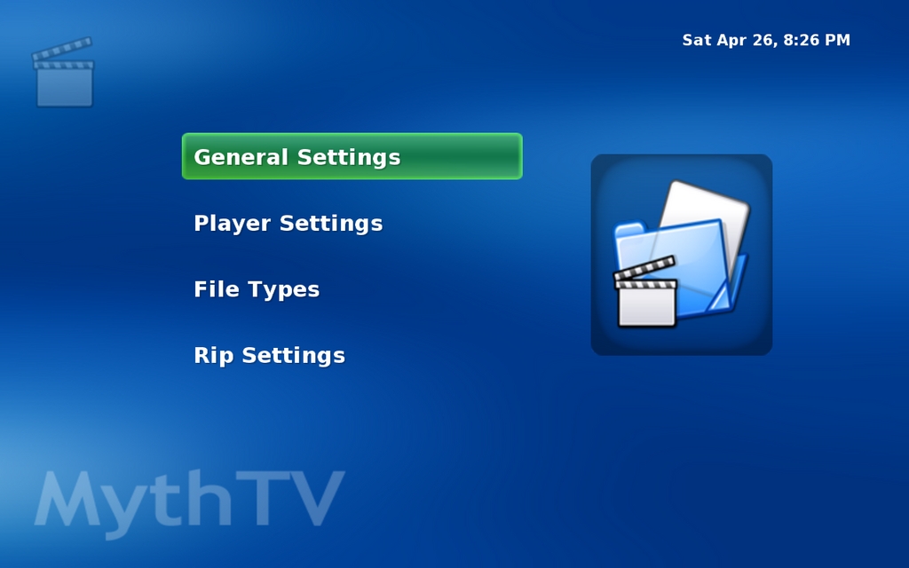 MythVideo can be configured on two sets of pages. The first is found under Setup→Video Settings. These pages allow global configuration of items like the MythVideo storage directory (under General Settings), how the gallery will lay out thumbnails (also under General Settings), which tools to use for playback (under Player Settings) and ripping options (under Rip Settings).