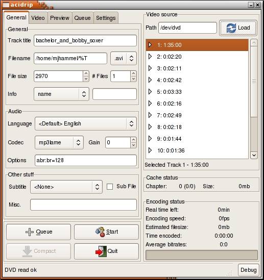 The first step in using MythVideo is to rip your DVDs. There are a number of tools for doing this, including a MythTV DVD ripper, but I've found AcidRip to be the easiest to use for beginners (advanced users will want to move on to DVD::RIP or try using the command-line utilities MEncoder and Transcode). You'll want the smallest files you can get, without significant loss of quality, using the AVI file format with the audio and video ripped to MPEG-3 and MPEG-2, respectively. Other formats might produce better quality or smaller files, but if you're just getting started, start with these settings. Fortunately, these selections are the default with AcidRip, so the only thing you need to do is play with the file size in order to find the smallest size (see the General tab File Size field) with the best video quality (see the Video tab bits/px and Bitrate fields).