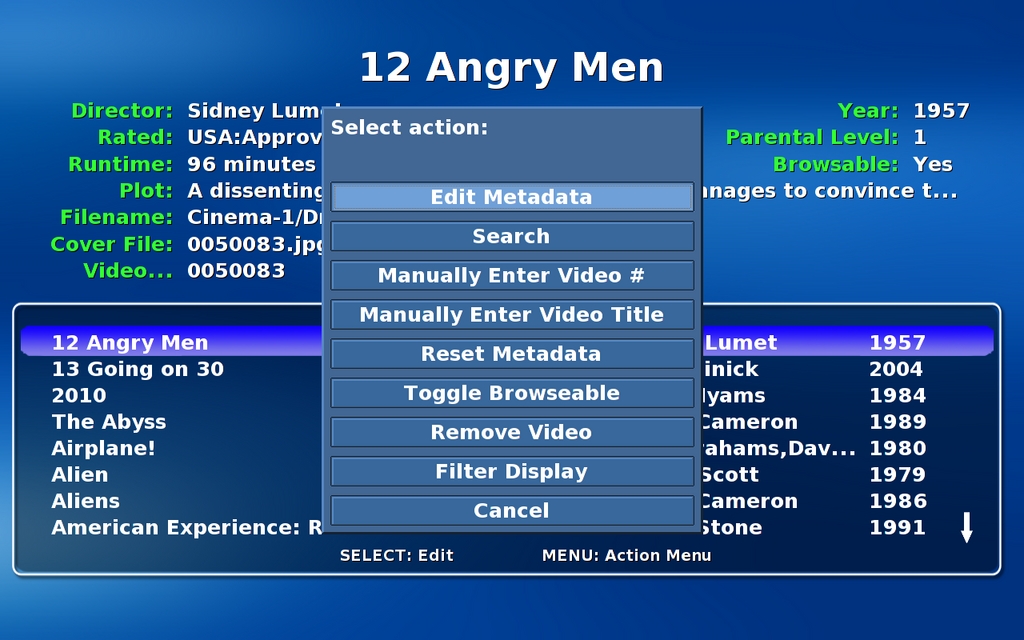 Page through the videos, if necessary, until you find the new entry. With the entry highlighted, press M for the menu, then select Search. If all goes well, MythVideo will find the video on the IMDb database and fill in the metadata for you.