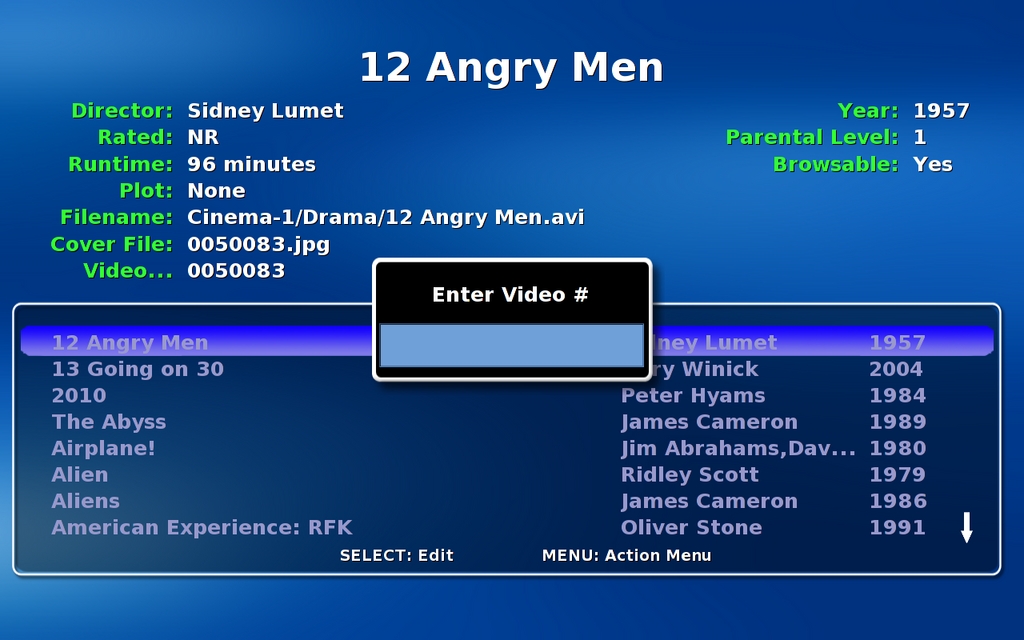 To update the database, choose Videos→Video Manager. This takes you to a page where you can select a video to edit. Your collection is listed alphabetically by video title with the director and year also listed. New additions to the MythVideo storage directories show up with the filename, followed by Unknown for the director and a question mark for the year.
