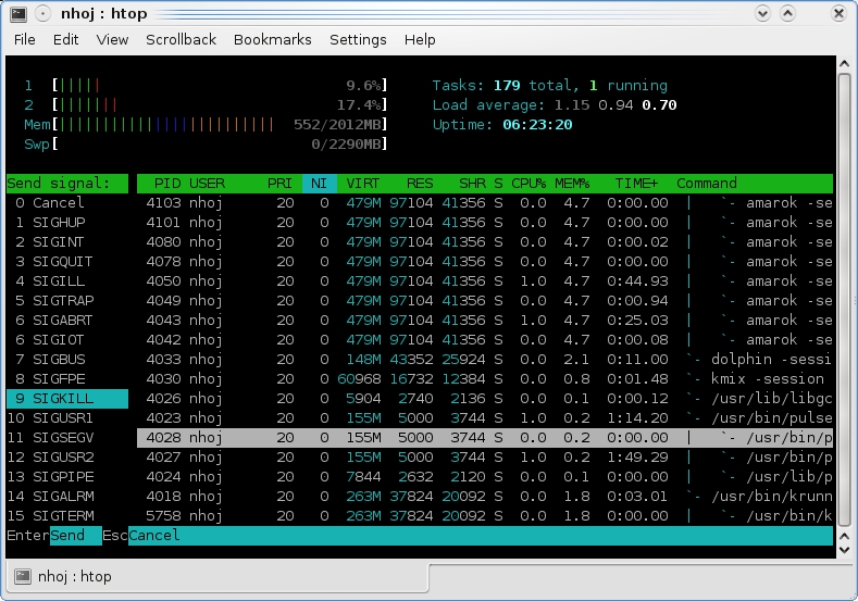 To get started, you can browse through your processes with the arrow keys along with Page Up and Page Down. If you want to kill or tinker with a process, press either K or F9. At this point, htop brings up a menu of possible signals to send the program, with SIGTERM being the default choice. Scroll through these if you want to play with more-advanced features, but for most users, just pressing F9 and Enter will do the job fine.