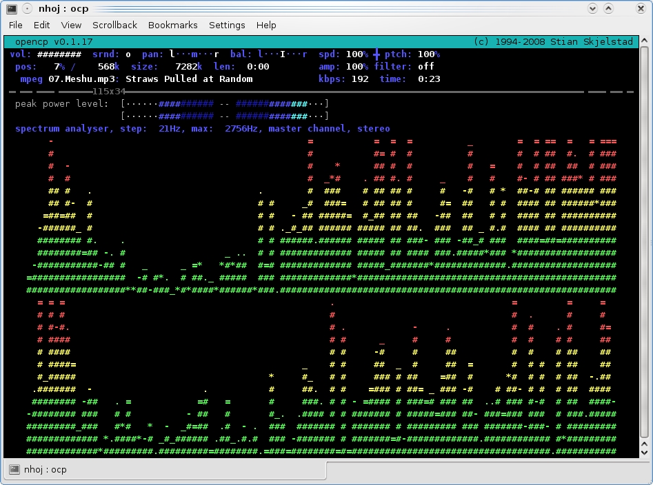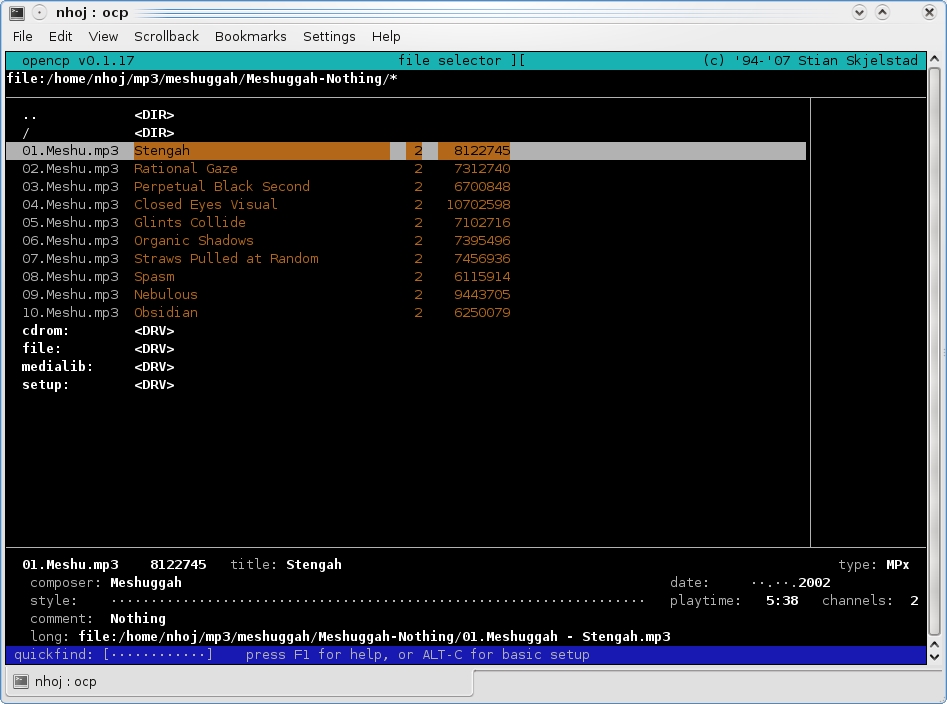 Open Cubic Player (OCP) is a text-based audio player that runs in various incarnations on Linux and Windows, and there's even an older DOS version. First appearing in late 1994, the original program was a binary-only freeware version called Cubic Player (running primarily in DOS). It had a reputation for being one of the best module players around, as it supported a great deal of soundcards as well as audio formats. As Windows grew more popular and people demanded GUI-based software, popularity and support for the program died off, as did the project itself.