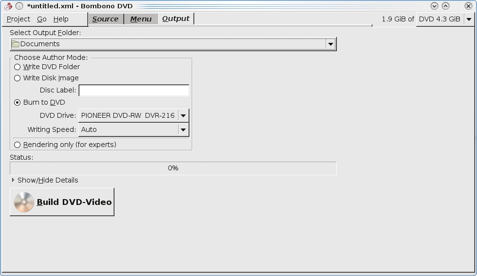 When you're happy with your soon-to-be DVD, head to the Output tab. Here, you can choose either to write a DVD Folder or make a disk image on hard drive, or you can just burn the project straight to DVD.