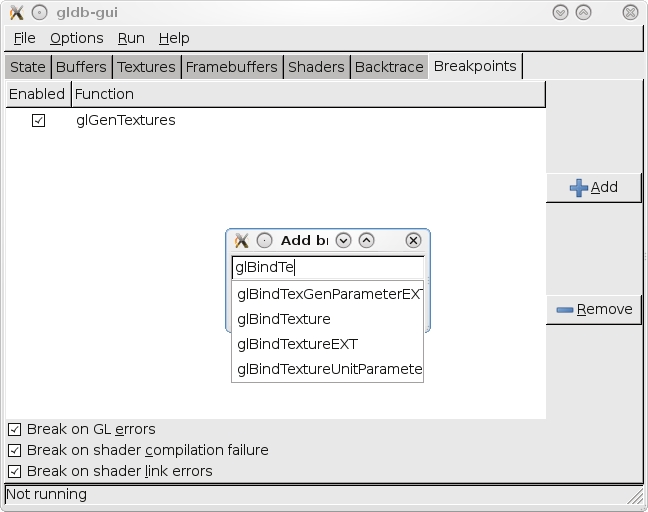 This last command starts BuGLe's GUI, but your program won't be running yet. Prior to running something, you can apply certain parameters, such as setting breakpoints on specified OpenGL functions. For information on this, check the Web site's documentation (although it seems to be geared more for other developers than users at this time of writing).