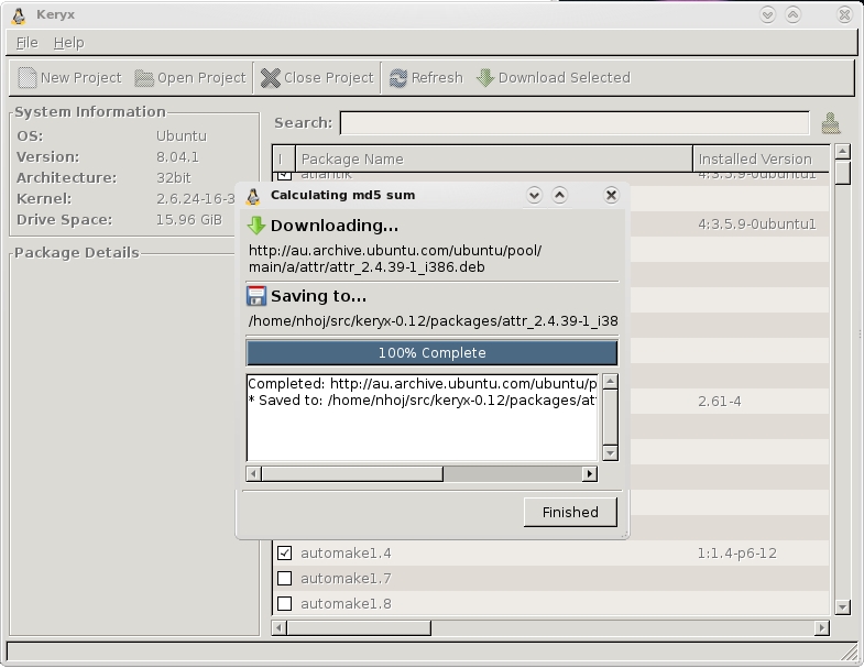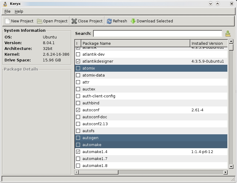 Once Keryx has sprung back to life, you'll be presented with a long list of packages, Synaptic style. For choosing packages to install, the interface is a little quirky. Those tick boxes won't let you choose a package; they just tell you whether it's installed already. To install a package, click on the actual name of the package, and if you want multiple packages, Ctrl-click or Shift-click the same way you would in any modern file manager. When you're ready to download the packages, click Download Selected at the top-right of the screen. Keryx will download everything and save any downloaded packages to the packages folder in the main keryx directory.