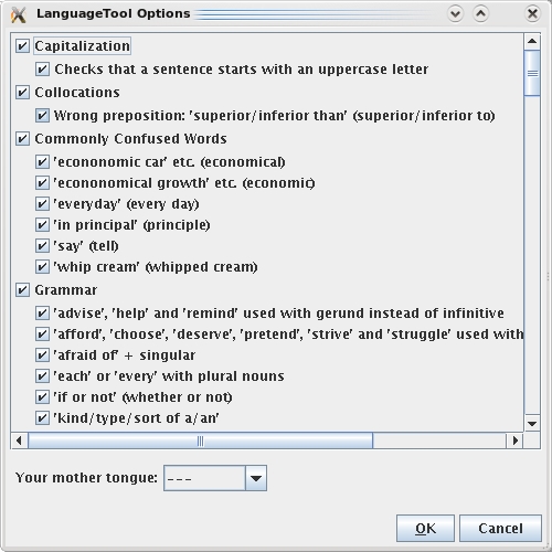 With LanguageTool installed, the first thing you need to do is choose your language. Click Tools→LanguageTool→Configuration, and once inside the configuration screen, choose your default language under the drop-down box titled Your mother tongue:. Notice that big list of language rules? It's pretty impressive, don't you think? For those with OOo 3.x, life is slightly easier. Simply type some text in the main screen, and it should check it automatically (the Web site recommends typing “This is an test.” for some deliberately bad grammar). For those on the 2.x series of OOo, you need to choose Tools→LanguageTool→Check Text each time you want to check some text.