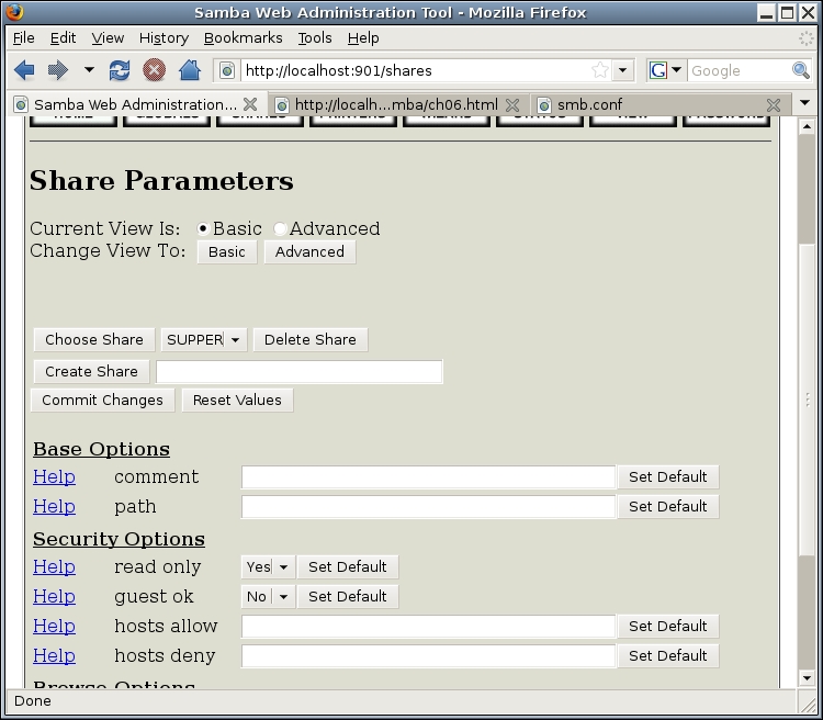 Let's set some security options shown in Figure 1. By default, at least on Ubuntu systems, Swat displays only four options under this section in its basic view, but that's a reasonable starting point.