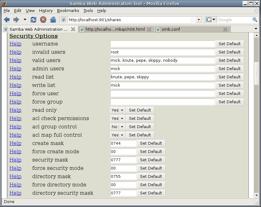 But wait, what's this? Where did those values for valid users, read list and so forth come from, given my earlier sidebar note about these screenshots showing default settings?