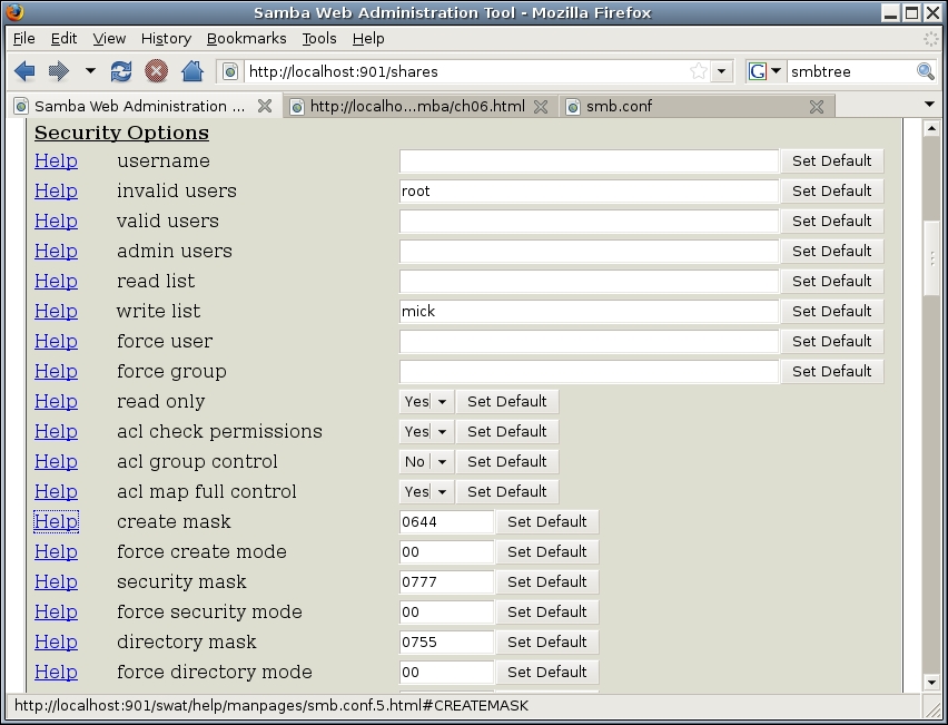 The last security setting to change is create mask. This option determines the UNIX permissions that will be given to any files moved into or created in the share. Its value must be a chmod-style octal mode, as described in the chmod(1) man page.