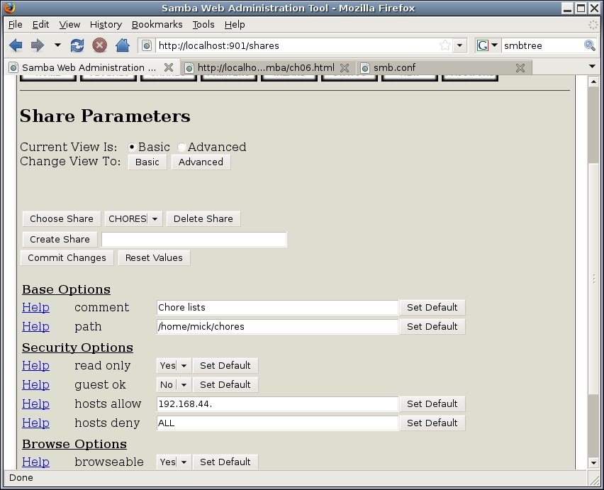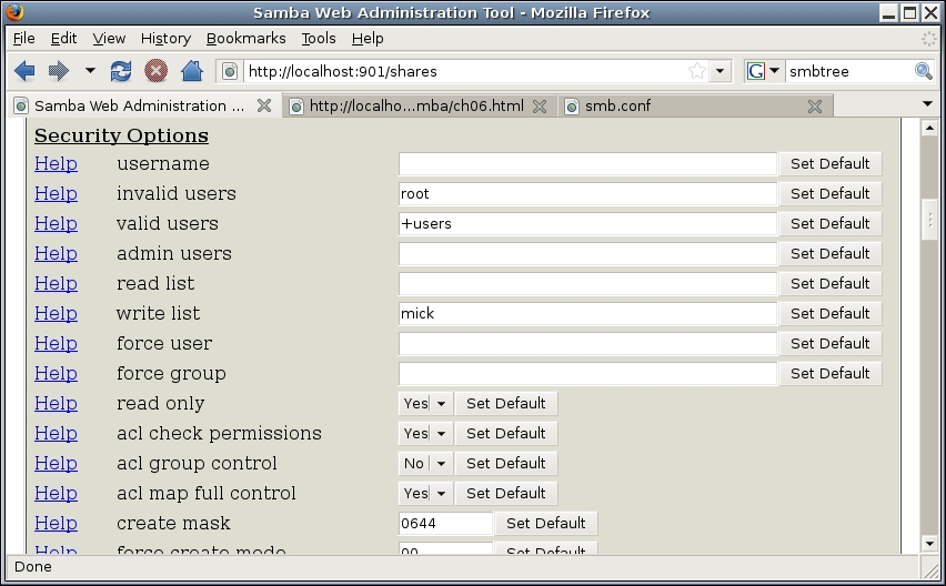 The screenshots in Figures 1 and 2 show Ubuntu's default values for the various settings in Swat. They, therefore, do not provide, all by themselves, a model of how to configure Samba securely! Read the accompanying text for my recommended (secure) settings.