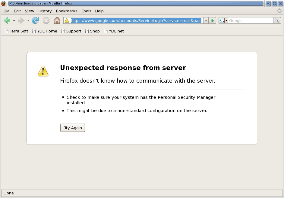 The next most annoying issue I encountered was the one I mentioned before. When I started Firefox after logging in the first time, I could go anywhere I wanted to on-line except any https:// Web sites. For some reason, Firefox complained about not having the Personal Security Manager, which was weird, because Firefox was installed (with all of the required pieces).