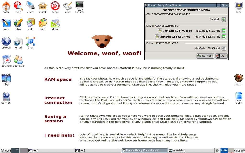 The first thing you'll likely want to do after booting is launch the Puppy Disk Mounter. Refer to the upper-right section of Figure 1. It can be launched through the top-row drives icon. Notice that drive partitions hda1 and hda2 are mounted under the /mnt directory. The output of the df -h command shows the following: