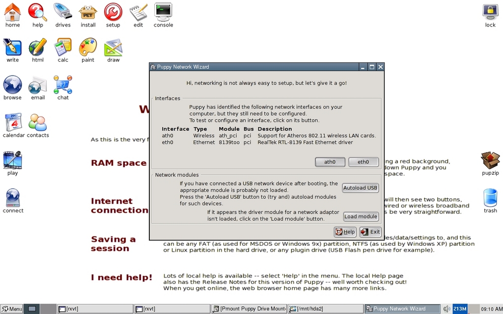 Not just making a “puppy” quip here—if PL was able to configure your audio device during the boot process, you'll hear the sound of a gentle dog bark, “woof, woof”. If not, a sound wizard can be launched from Menu→Setup→Wizard Wizard to attempt a manual sound card setup.