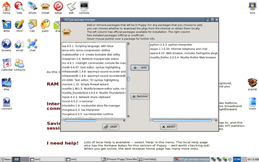 PETget is very straightforward to work with. Typically, it's used to download updates and additions from the network (using wget), and it finds and resolves dependencies fairly seamlessly. The PETget operations can be very interactive, and the dialogs present a lot of information. Be sure you understand what's being installed or updated, and that you'll need to restart the window manager (Menu→Shutdown→restart-JWM) before new applications are added to the Menu button structure. Also, depending on what's been installed, because so much of the runtime is maintained on the RAM disk for efficiency, the system may need to be rebooted. So, take time to read the PETget dialogs.