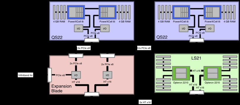 The machine is composed of a unique tri-blade configuration consisting of one two-socket dual-core Opteron LS21 blade and two dual-socket IBM QS22 Cell blade servers. Although the Opteron cores each are connected to a Cell chip via a dedicated PCIe link, the node-to-node communication is via InfiniBand. Each of the 3,456 tri-blades can perform at 400 Gigaflops (400 billion operations per second).