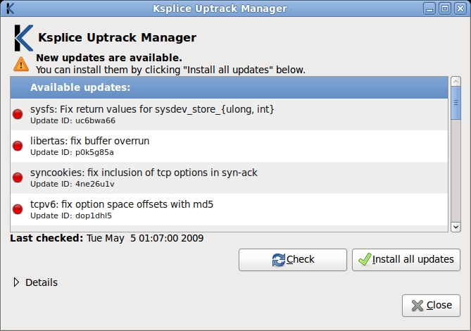 That said, you still can reap the benefits of this new technology by using the Ksplice Uptrack service without having to do any of the work, because the Ksplice Uptrack folks have done it for you.