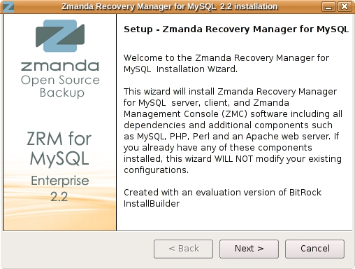 I evaluated the Zmanda Recovery Manager for MySQL Enterprise edition version 2.2. The test platform (ZRM server) was Red Hat Enterprise Linux 5.1 installed on a PC with an Intel Dual Core 3GHz processor, 4GB of system memory and a 750GB SATA hard disk. I installed MySQL Community Server version 5.0.51a-0 locally on the ZRM server as well as on another PC with Ubuntu 7.10 server installed. With this configuration, I was able to test ZRM's ability to back up from and restore to local and remote MySQL servers. Note that MySQL versions 4.1.x are also supported by ZRM. Finally, I set up my test databases on a 50GB LVM (Logical Volume Manager) partition to test ZRM's hot backup capabilities.