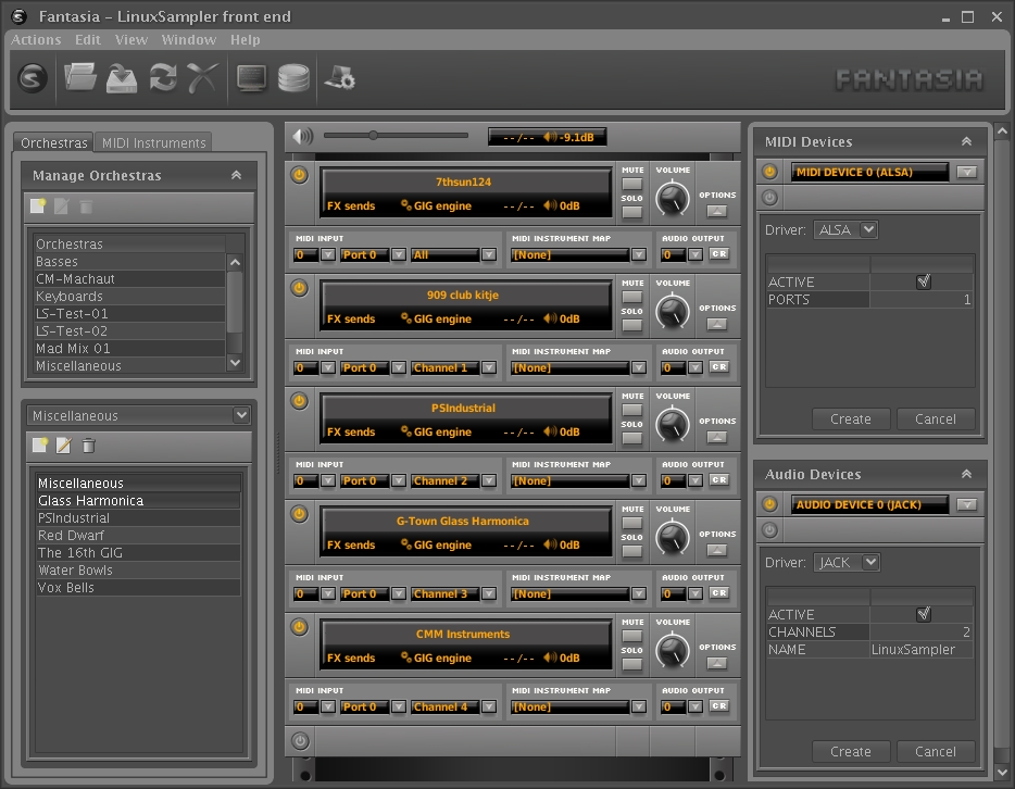 Samplers are represented by Specimen and the LinuxSampler Projects. These applications differ in some significant ways: LinuxSampler utilizes files in the GIG format made popular by Tascam's GigaSampler, and Specimen is happier with soundfile formats supported by libsndfile. LinuxSampler (Figure 2) is a client/server architecture with at least two GUIs and a command-line interface. Specimen is a standalone GTK-based application. LinuxSampler and Specimen both support JACK, but Specimen also supports ALSA and is a LASH-savvy application. LinuxSampler has more features associated with the GigaSampler model and is the more consistently maintained program, but both samplers are useful in the complete Linux music-maker's studio.