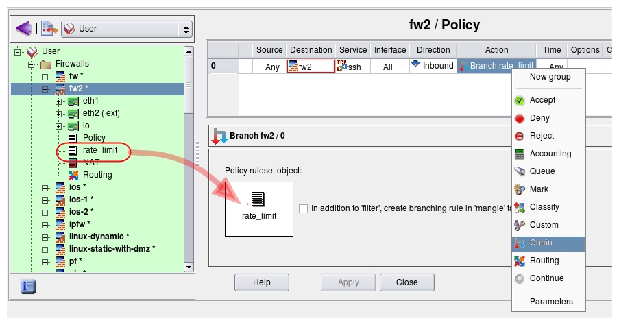 Multiple rules can use the Chain action to pass control to the same branch rule set if necessary. Abstraction of branching rules in Firewall Builder opens access to the very powerful mechanism of chains and anchors in the underlying firewall software. This can be used for rule optimization or to build dynamic policies where a branch rule set is populated by an external script at runtime.
