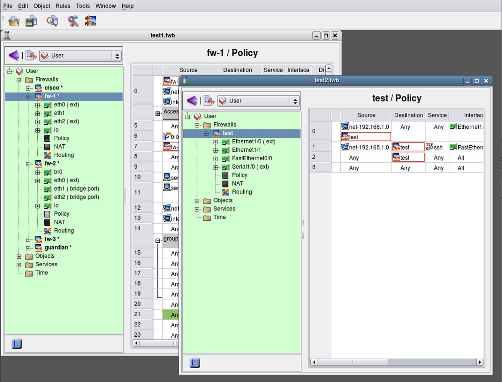 Expanding on this concept, Firewall Builder 3.0 allows you to open multiple data files at once (Figure 2) and move objects between them using drag-and-drop or copy/paste operations. You can expand one data file so that it occupies the whole window, or you can arrange several data files so they are all visible at the same time.