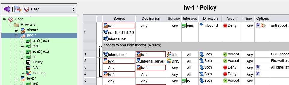 Now that the firewall object and objects for its interfaces have been created, you can add some rules. Figure 4 shows a fragment of a firewall policy.