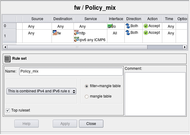 The first rule uses the interface object of the firewall that represents its loopback interface, and the second uses the object representing the firewall itself and two service objects: “http” and “ipv6 any ICMP6”. The rule that permits any protocols on loopback should be similar for IPv4 and IPv6, but the rule that permits http and any ICMP6 will look different. Here is what the generated iptables script looks like: